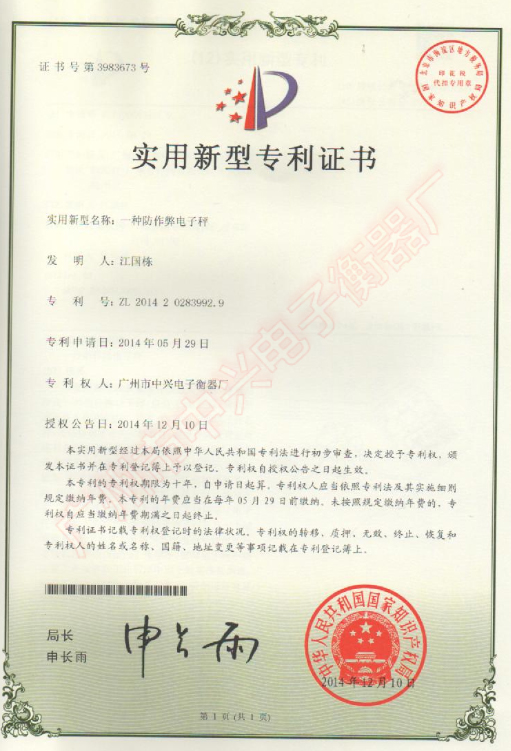 防作弊電子秤專利證書