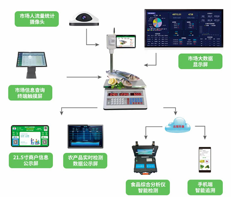 采用市場(chǎng)人流量統(tǒng)計(jì)攝像頭,超清畫質(zhì),全方位監(jiān)控;市場(chǎng)信息查詢終端觸摸屏,可操作查詢市場(chǎng)簡(jiǎn)介、地圖、商戶信息、指導(dǎo)價(jià);21.5寸商戶信息公示屏,實(shí)時(shí)公示市場(chǎng)商戶信息、顯示商戶基礎(chǔ)信息;市場(chǎng)大數(shù)據(jù)顯示屏,交易數(shù)據(jù)統(tǒng)計(jì)分析;云服務(wù)器,分為食品綜合分析儀智能檢測(cè)和手機(jī)端智能追溯;農(nóng)產(chǎn)品實(shí)時(shí)檢測(cè)數(shù)據(jù)公示屏。